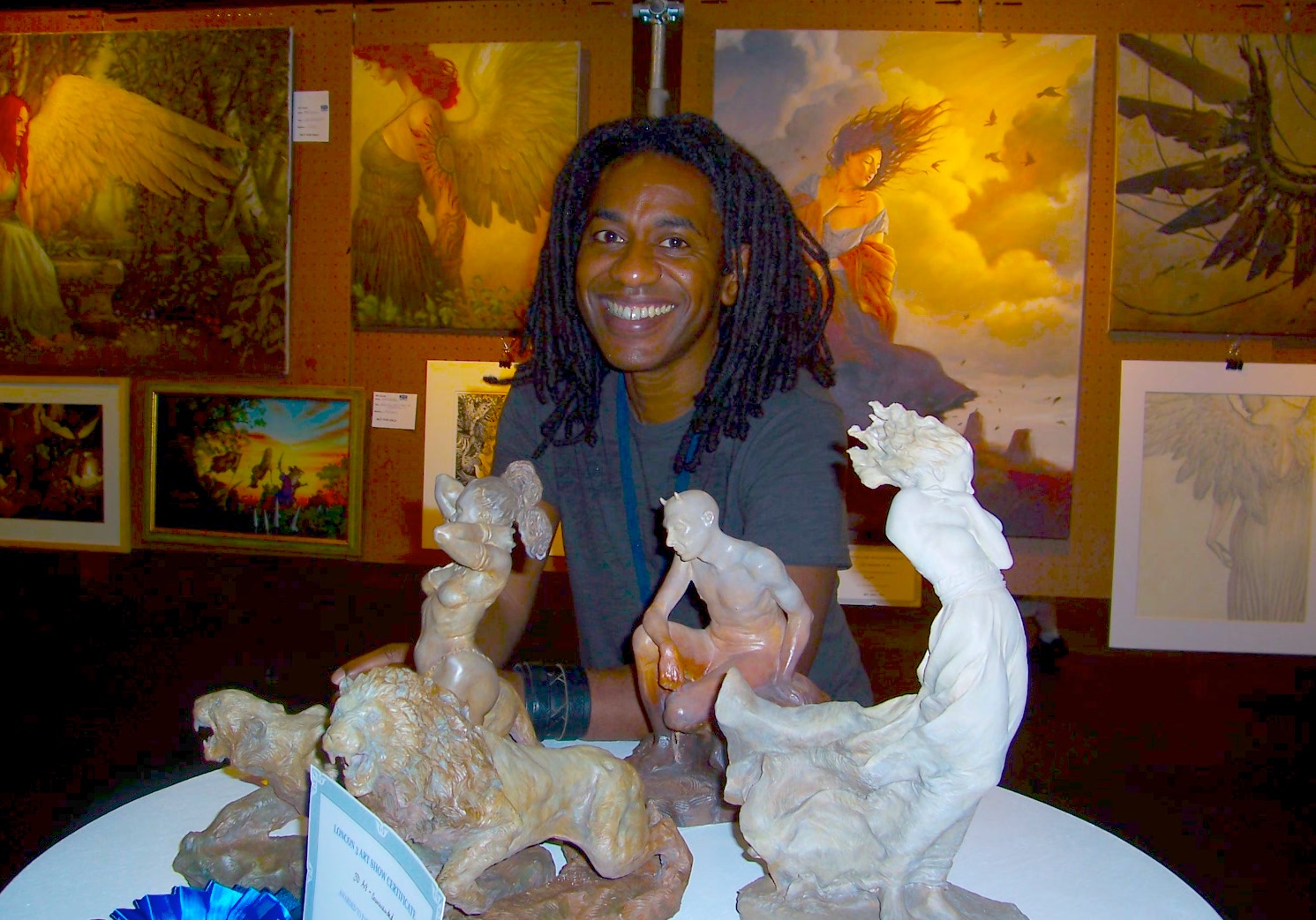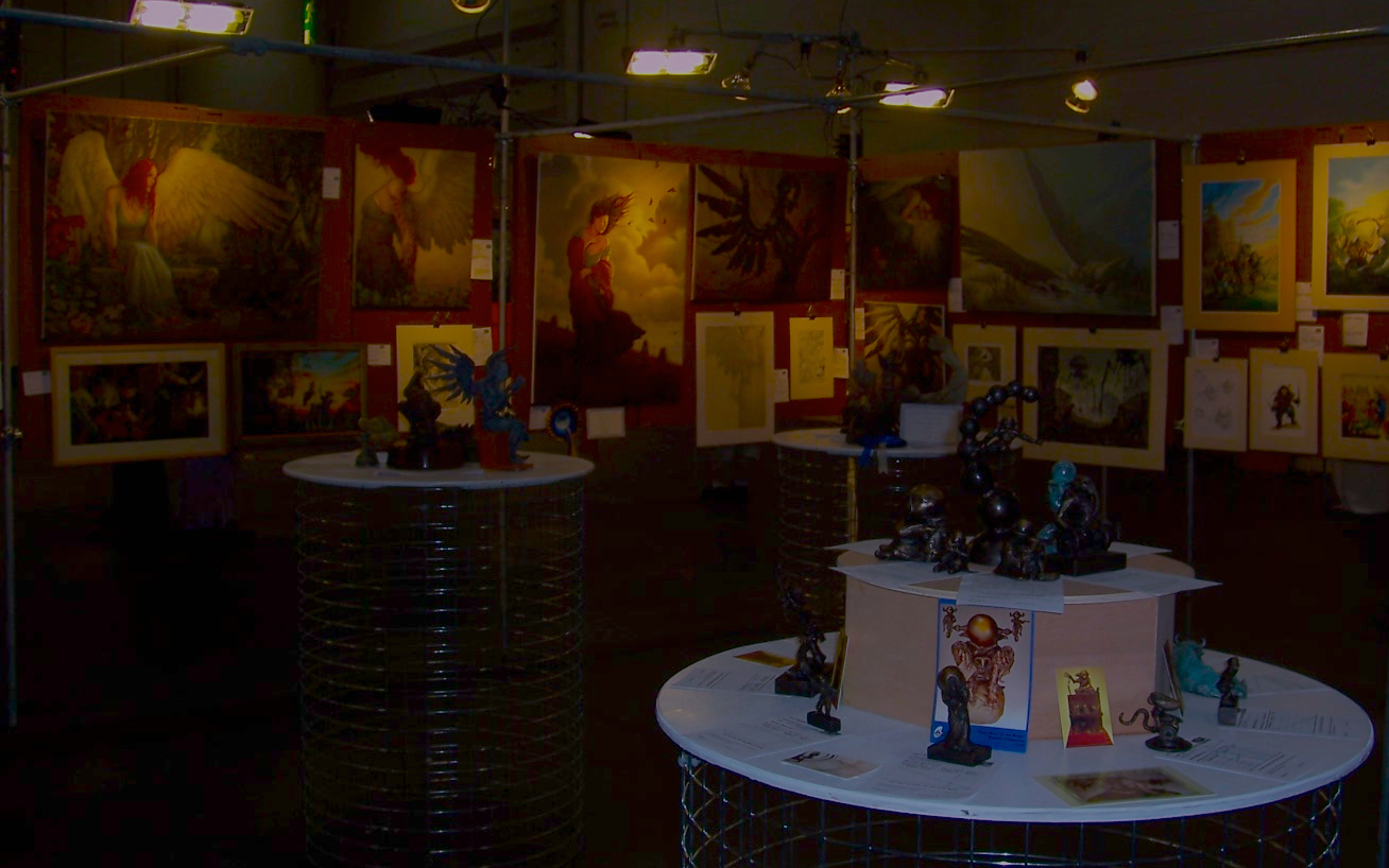 As I approach there are swarms of fans circulating around his gallery. Graphic fantasy paintings hang upon the walls, bold colours and delicate etchings attract art lovers. The detail is immense and there’s not enough time to take in everything for then I see his sculptures. They look alive, small soulful figures resting on the table top and are so very different to some of his other art works. And this sums up Fangorn, he’s multidimensional as his works have covered everything, from illustration, to painting, graphic art, sketching and sculpting. Nothing ever seems to be the same. His work is massively varied.