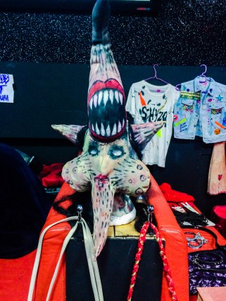 The first stall I drifted past was Estelle Riviere’s colourful stall. Estelle is known for making strange masks and other voodoo- psych-punk-goth inspired attire.