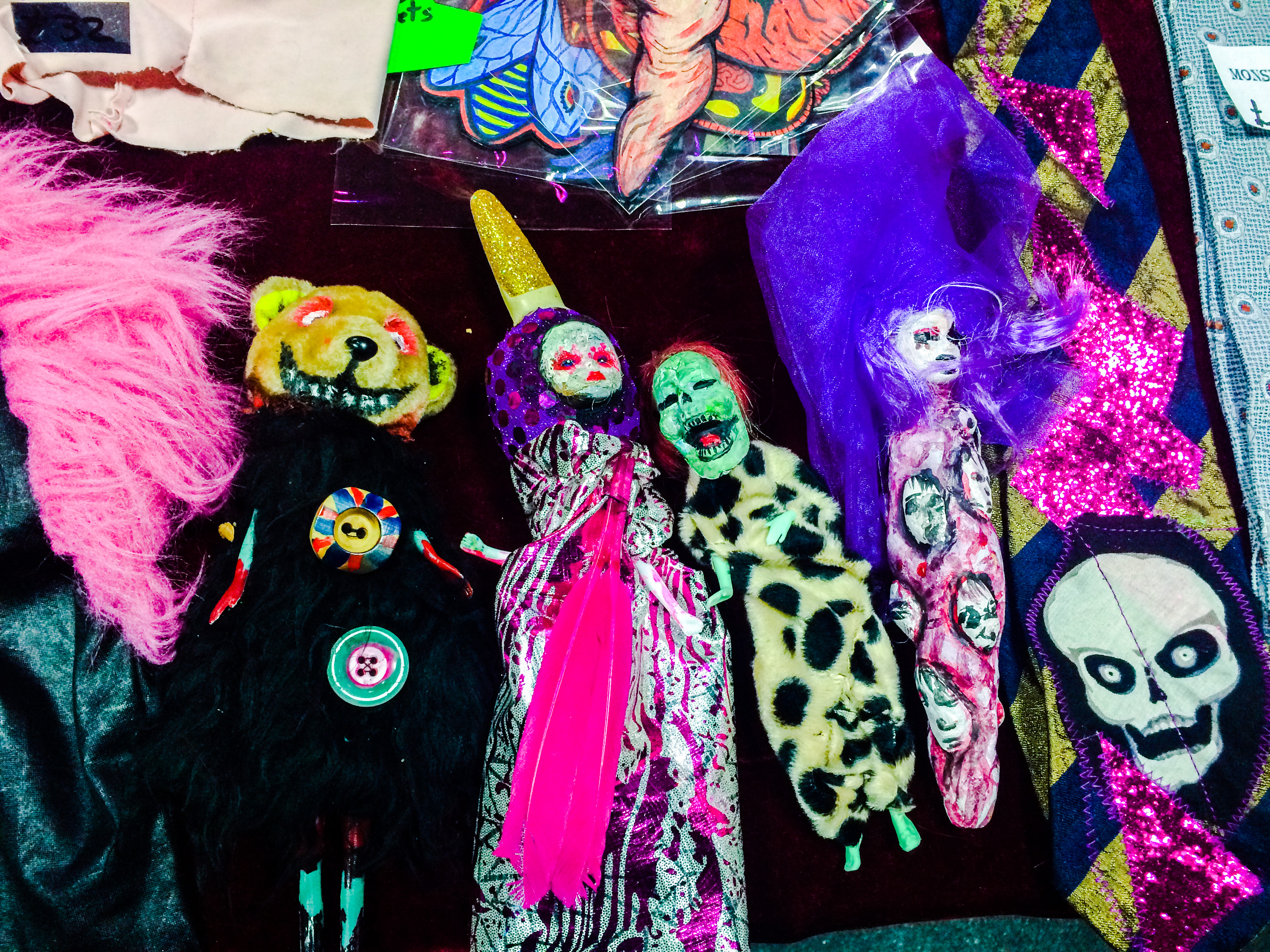 The first stall I drifted past was Estelle Riviere’s colourful stall. Estelle is known for making strange masks and other voodoo- psych-punk-goth inspired attire.