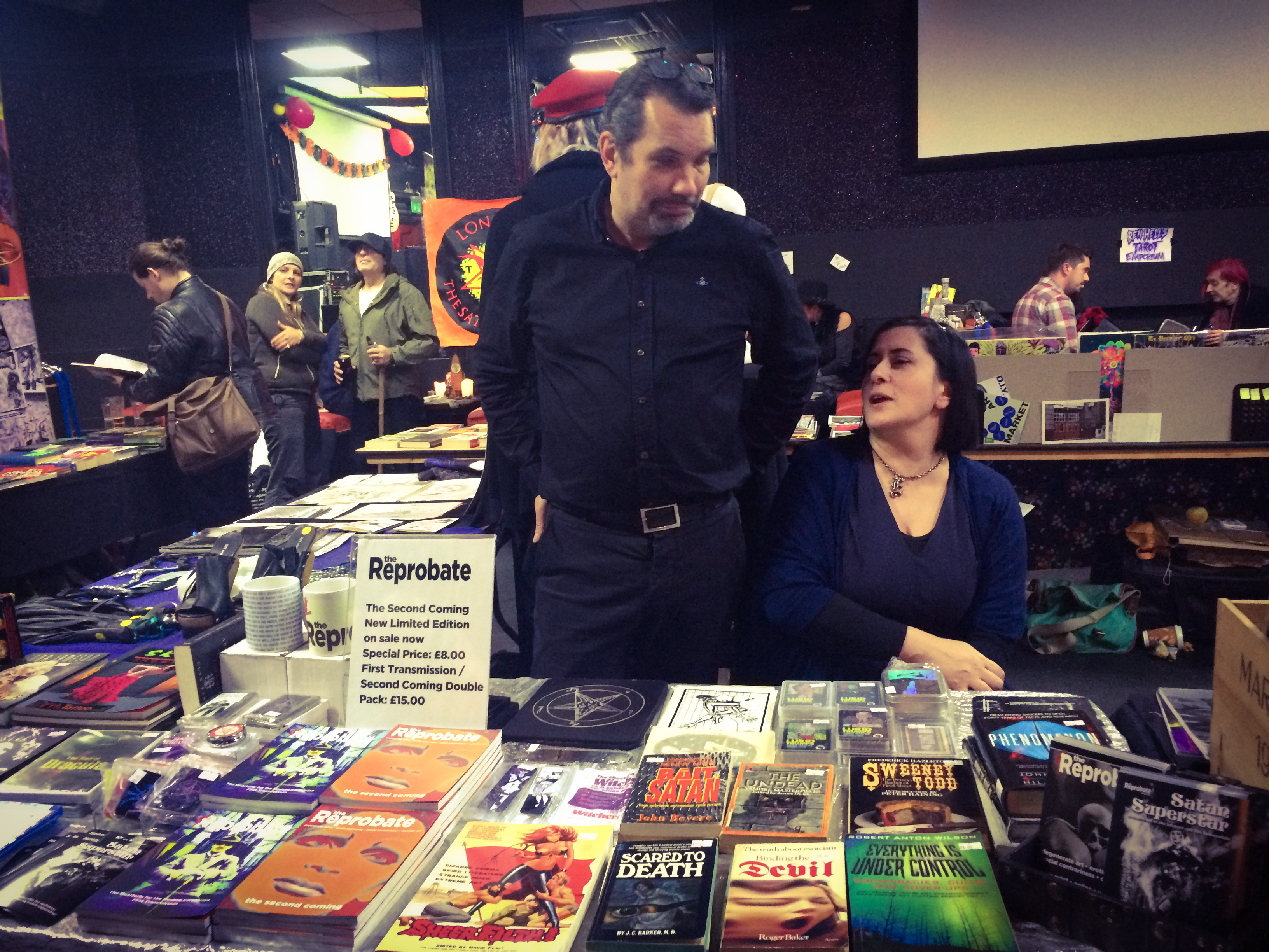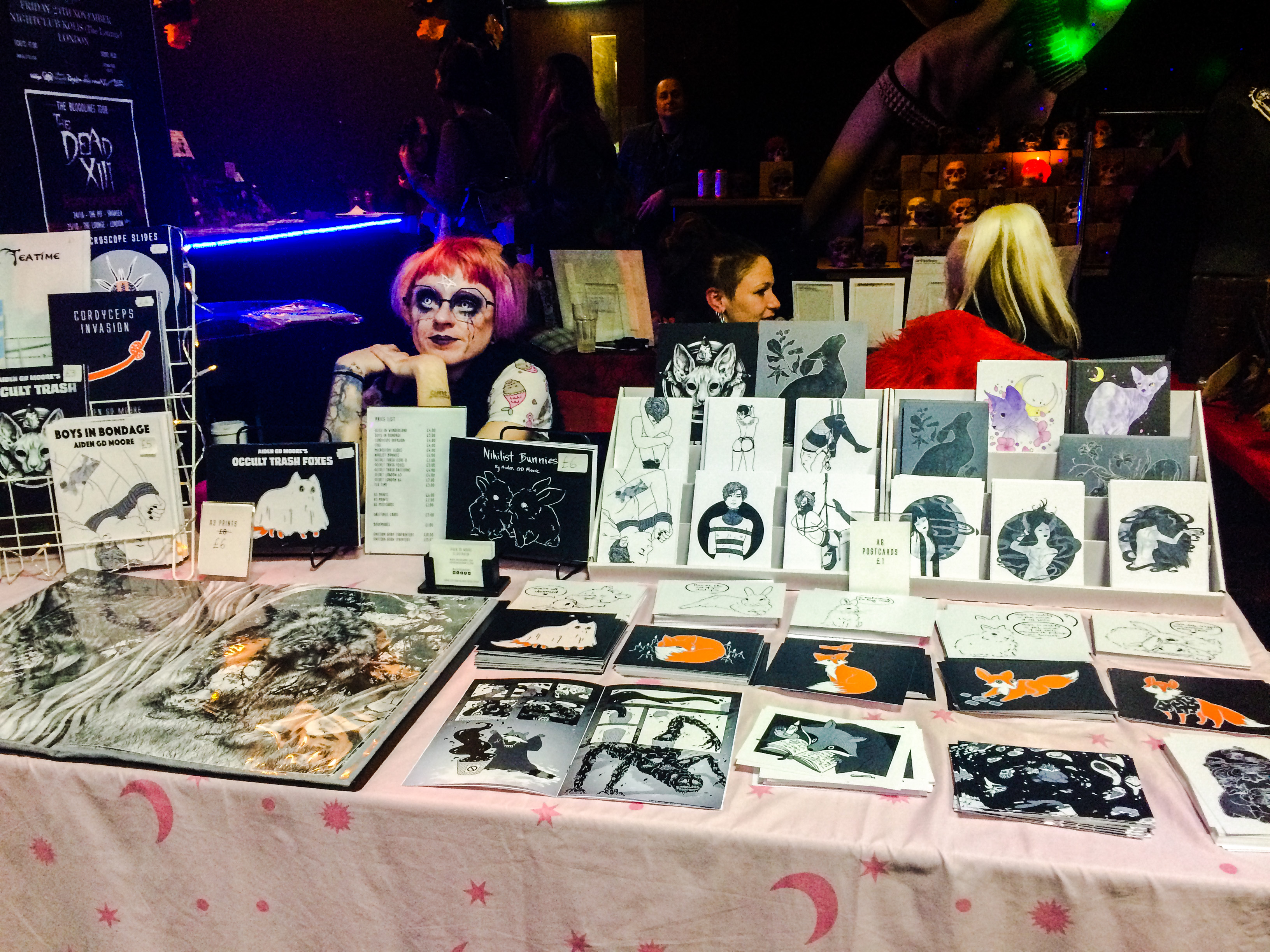 Having seen Jason at various goth-horror events I was enticed by his Satanic Flea market this week. Also known as the Samhain Dark Arts Fayre. I rallied a few friends together and made my way to what felt like a satanic mass. There, the dizzying sounds of Taka and Ays (Die Kur) echoed through Club Kolis, home to the Reptile Club and, according to Film and Theatre Producer Marcus Campbell Sinclair ‘Is definitely the best Goth evening (once a month) in London!’ As the afternoon morass began to unfold, we found ourselves wandering deeper into the dwelling, welcomed by the spectre of macabre arts.