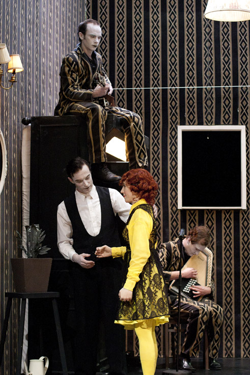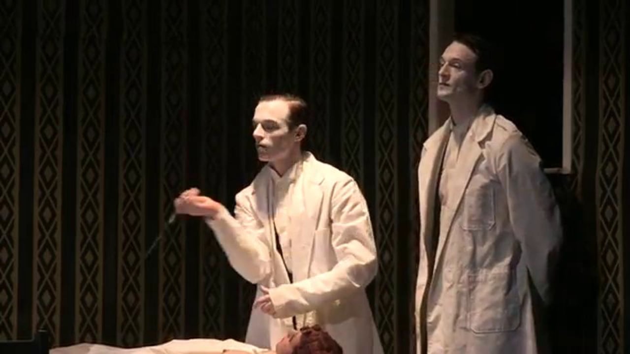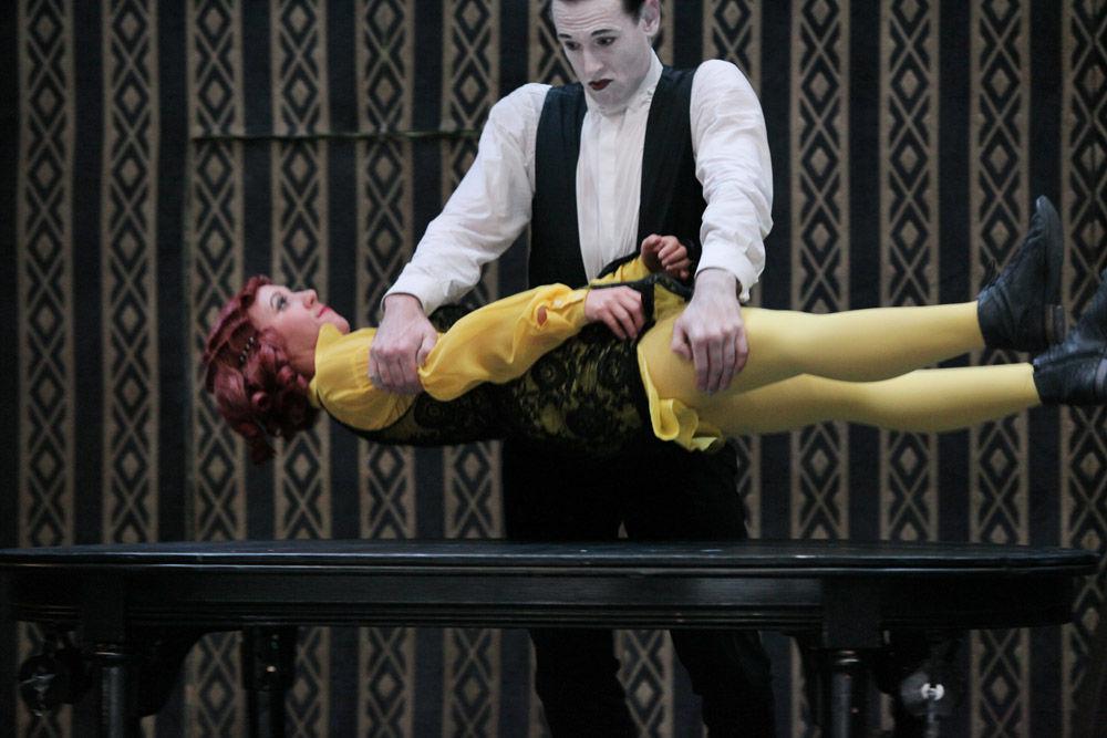 Ahlbom takes inspiration from the original film with the use of props and ingenious set-design such as chairs, walls and small kitchen cupboards where actors disappear and appear from. Riveting physical theatre and constant brawls through mime and dance keep the audience continuously engaged. There was also the classic leaping through the girl stunt which Buster Keaton performed in the film Sherlock Jr (1924), a stunt which was turned into a magic trick. Take a look at the original video.