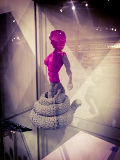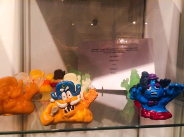 Looming over the display cases are these hideous yet sweet looking masks which remind me of the Care Bears. The unassuming and the vile combined, Dan’s tells us of how they came about.