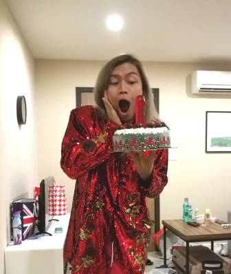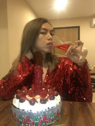 I put my beautiful sparkling outfit on ready for the birthday cake set with a red dick on the top yummy! My friends bought some food and drinks also. However, when we were about cut the cake, as I pulled out the paper around the “cake” to cut it, all of it just melted and turned into a big mess on the table.
