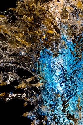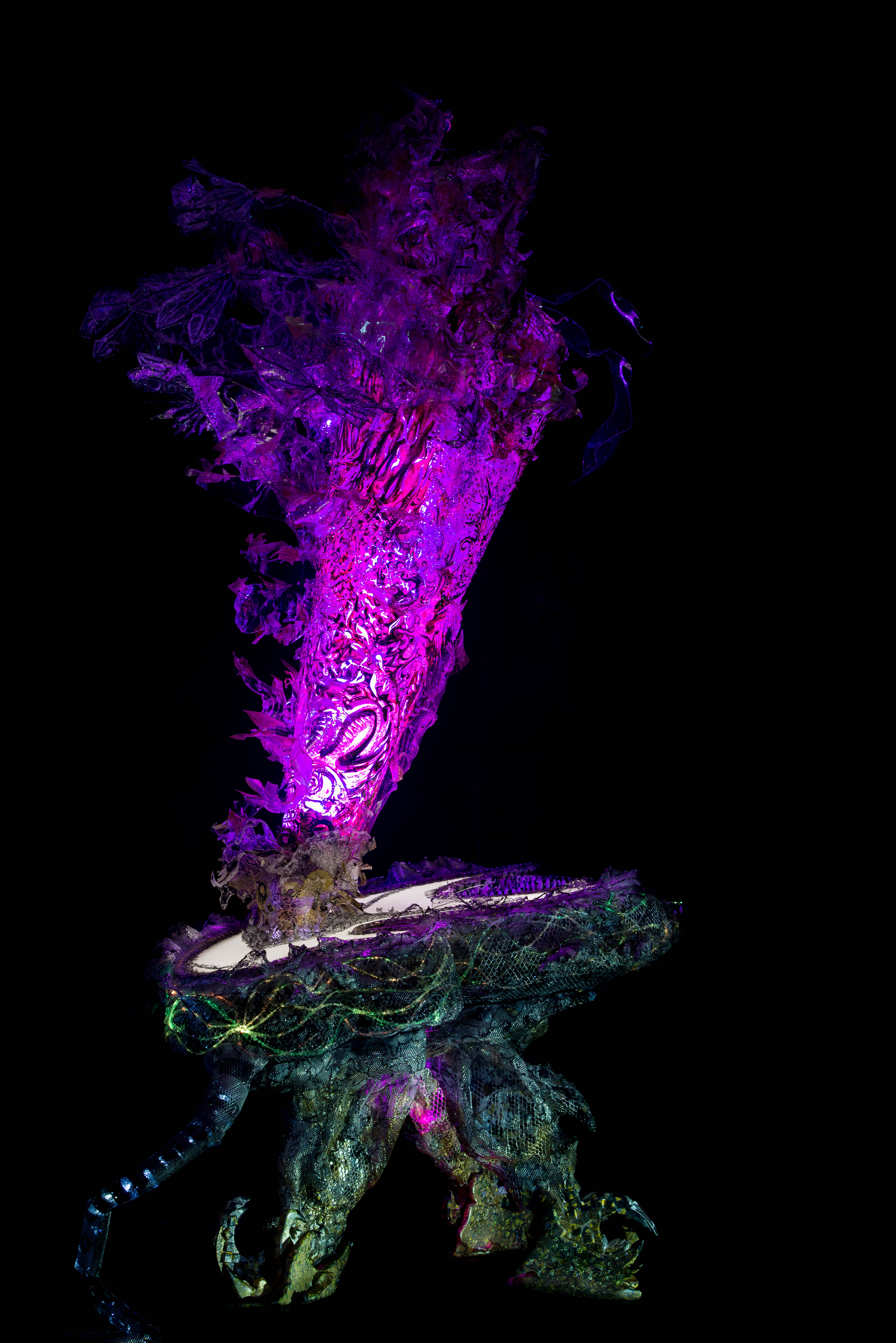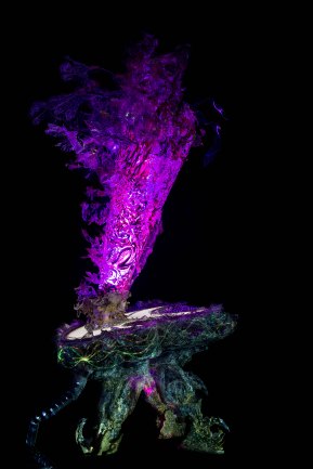 The evolution of AMALGAMEA is made from reclaimed wood, scrap perspex, found terracotta and metal mesh, hand drawn paper, oil paint LED and loads more. The textures are incredibly alien-esque in formation with marine-floral inspiration creating the basis of this hybrid piece.