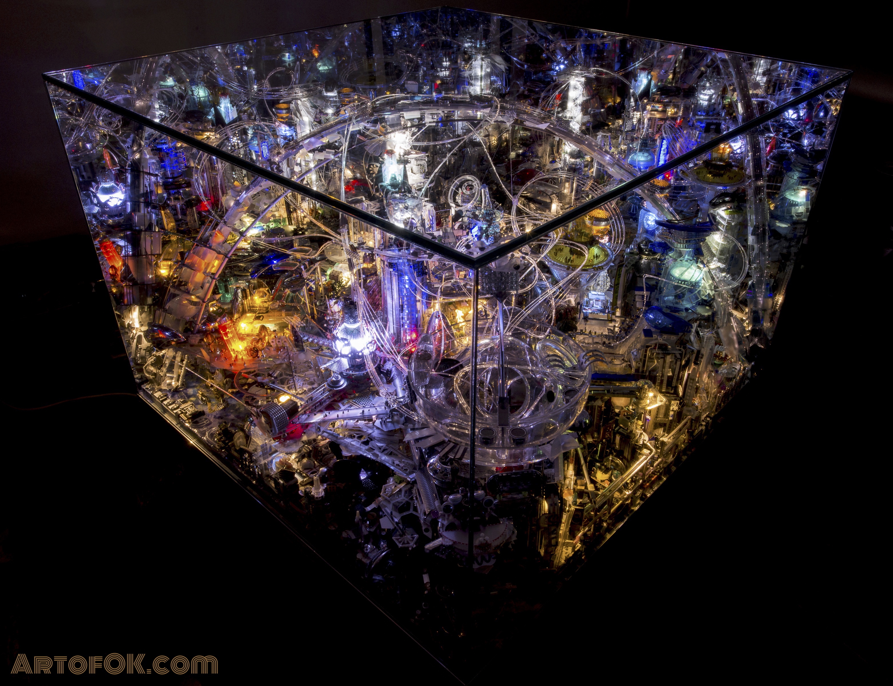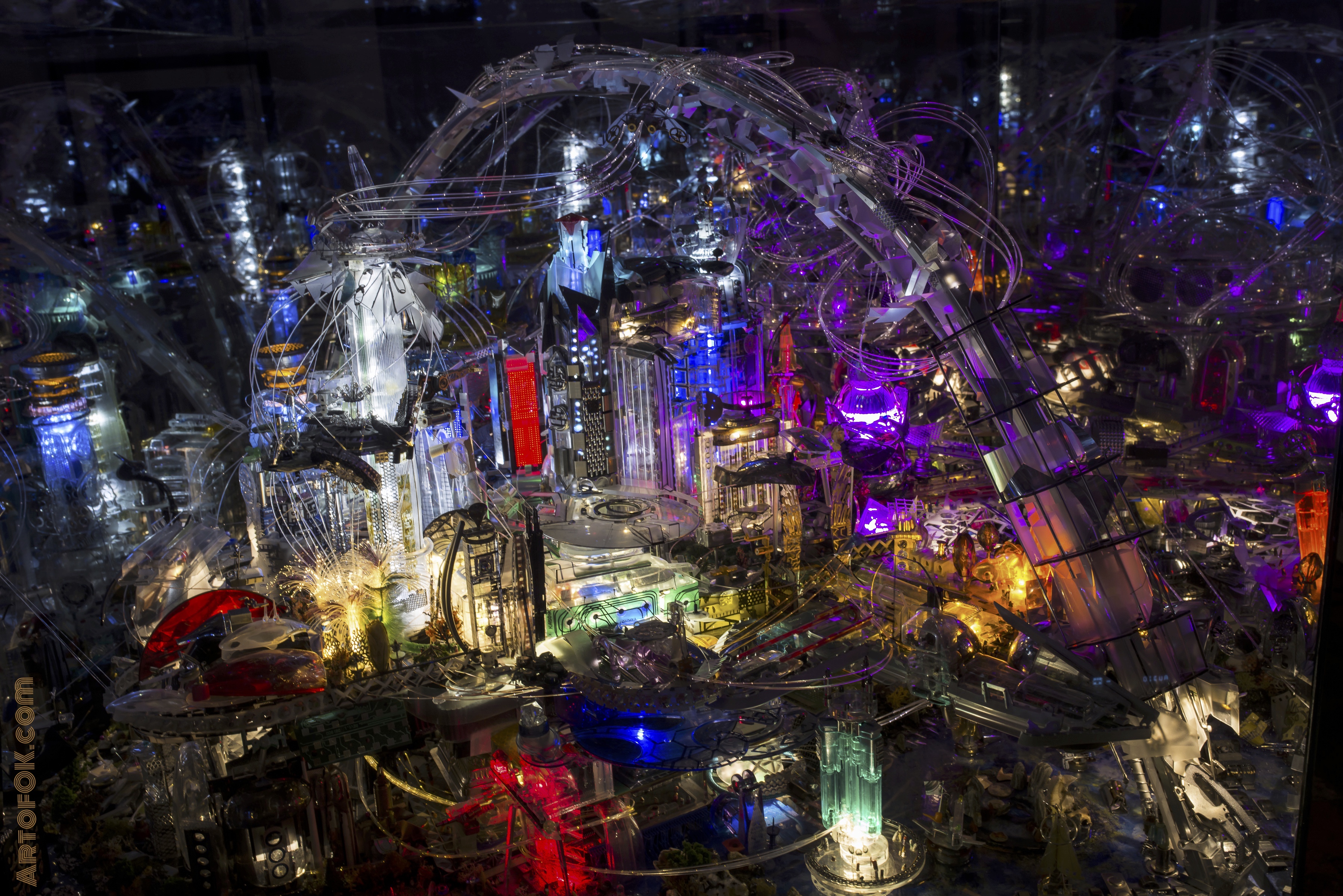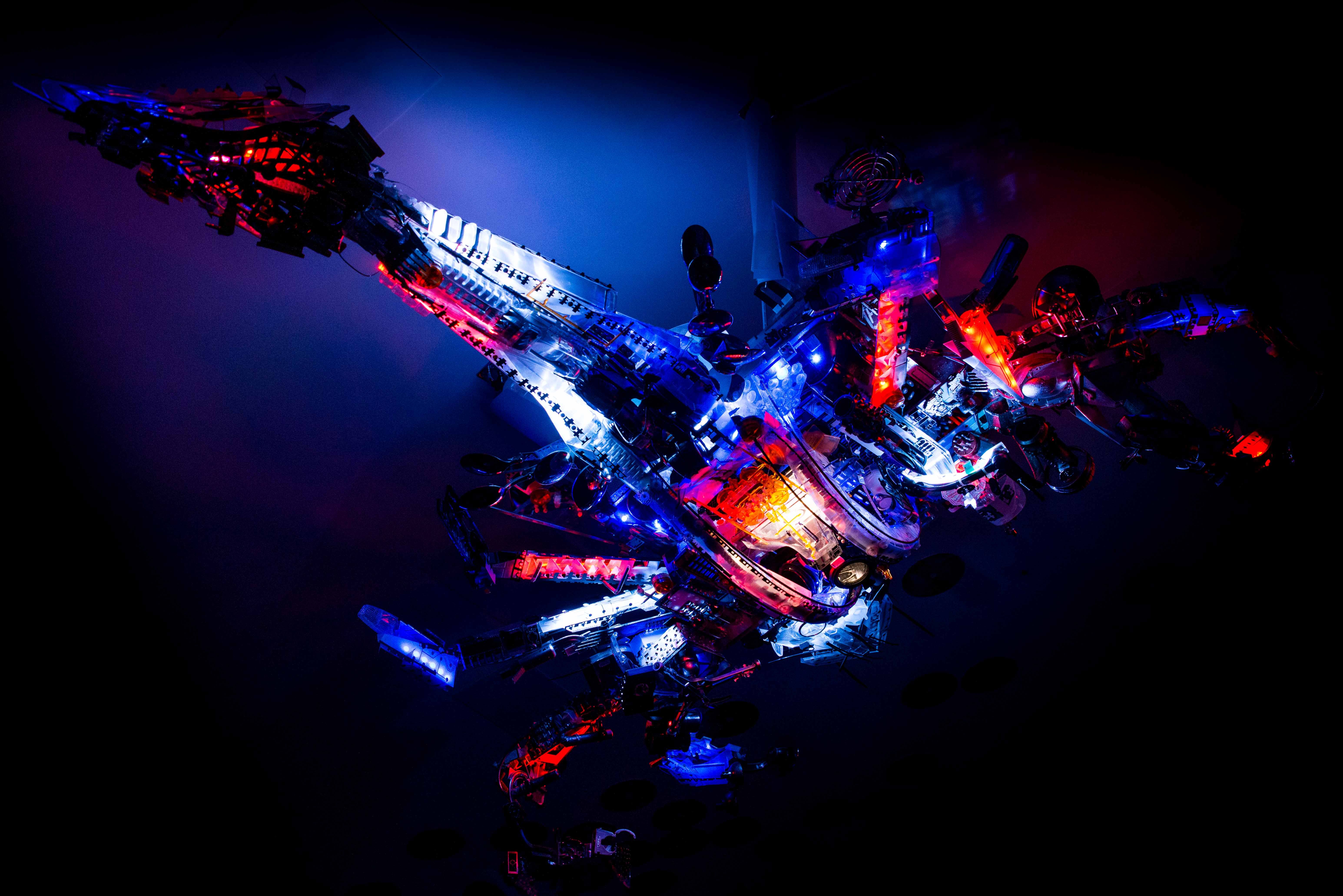 His exhibition RECYCLISM is comprised of intricately formed sculptures, robotics and dystopian lightbox metropolis’ made from recyclables.