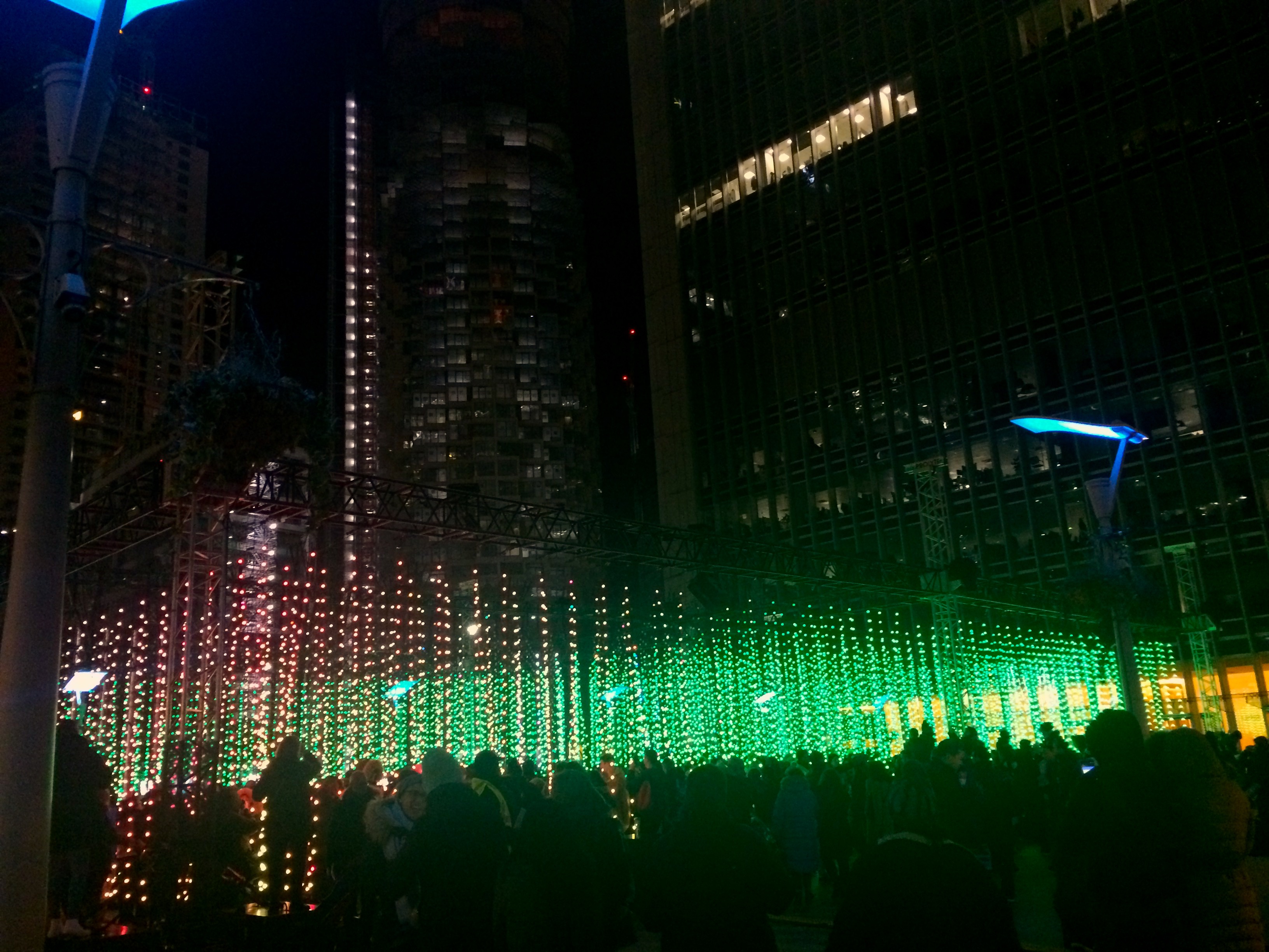 SUBMERGENCE by Squidsoup welcomed us as it illuminated in the middle of Montgomery Square with tiny LED bulbs hanging from cable/wire/string. The area itself appeared rectangular in form, but was decorated by free-moving bulbs. Working on a timed loop, the installation would begin with a soundscape that felt much like you were in the ocean which then transformed into a cosmos with planets, stars and other constellations dissolving in and out of existence. Because the lights were malleable, people would move them or walk in and out of the space, so this also created a trippy illusion and a prism of both planetary and deep aquatic reality.